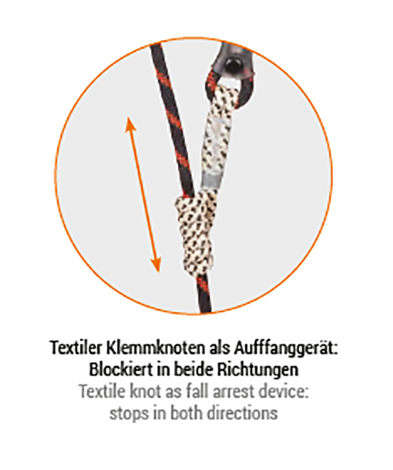 FOSSY besitzt anstelle des metallischen Auffanggeräts einen textilen Klemmknoten. Dadurch ist es leicht, anwenderfreundlich und sicher.