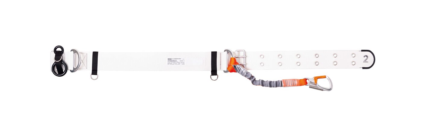 - Die Version B ist mit einem dehnbaren (Stretch-) Verbindungsmittel mit Alu-Einhandkarabiner gem. EN 362/T ausgerüstet, welches sich um die Sprossen einer Leiter wickeln lässt. Das Verbindungsmittel ist aus einem flammhemmenden Material (gemäß EN 137 geprüft) hergestellt.