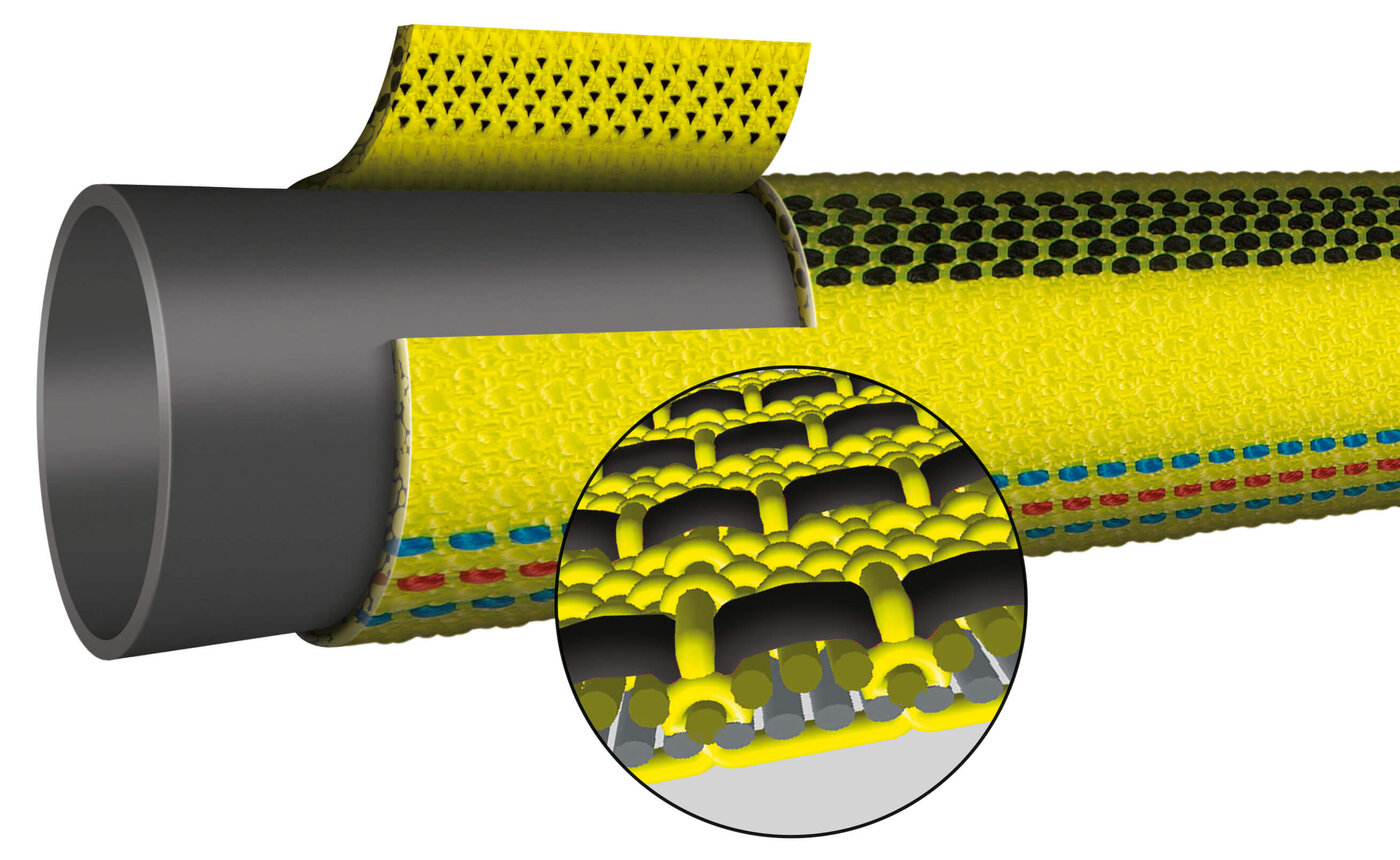 Die aus zwei Lagen ineinander verwebte Schlauchwand des INTRAX erhöht die Abriebbeständigkeit und den Schnittschutz und ist trotzdem leicht, wie ein herkömmlicher Feuerwehrschlauch.