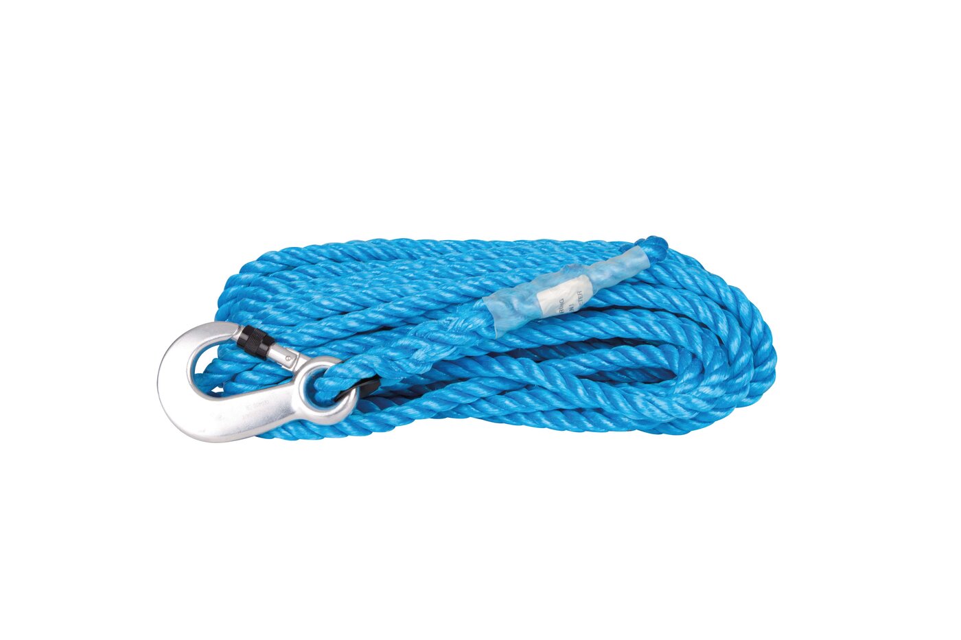 Arbeitsleine aus Polypropylen, gedreht, ein Ende mit Karabiner, anderes Ende mit Schlaufe.