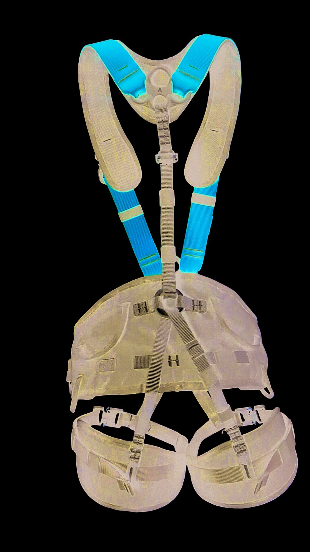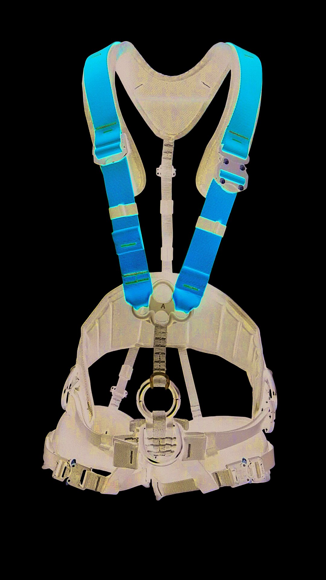 Die zwei textilen Schlaufen neben der ventralen Abseilöse bieten Platz zum Einhängen von Sitzbrettern.