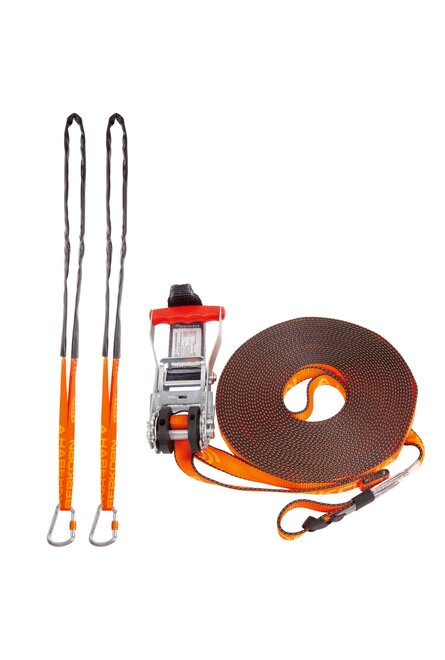 Die horizontale mobile Absturzsicherung aus PE Gurtband ist besonders widerstandsfähig und kann durch die integrierte Ratsche optimal vorgespannt werden.