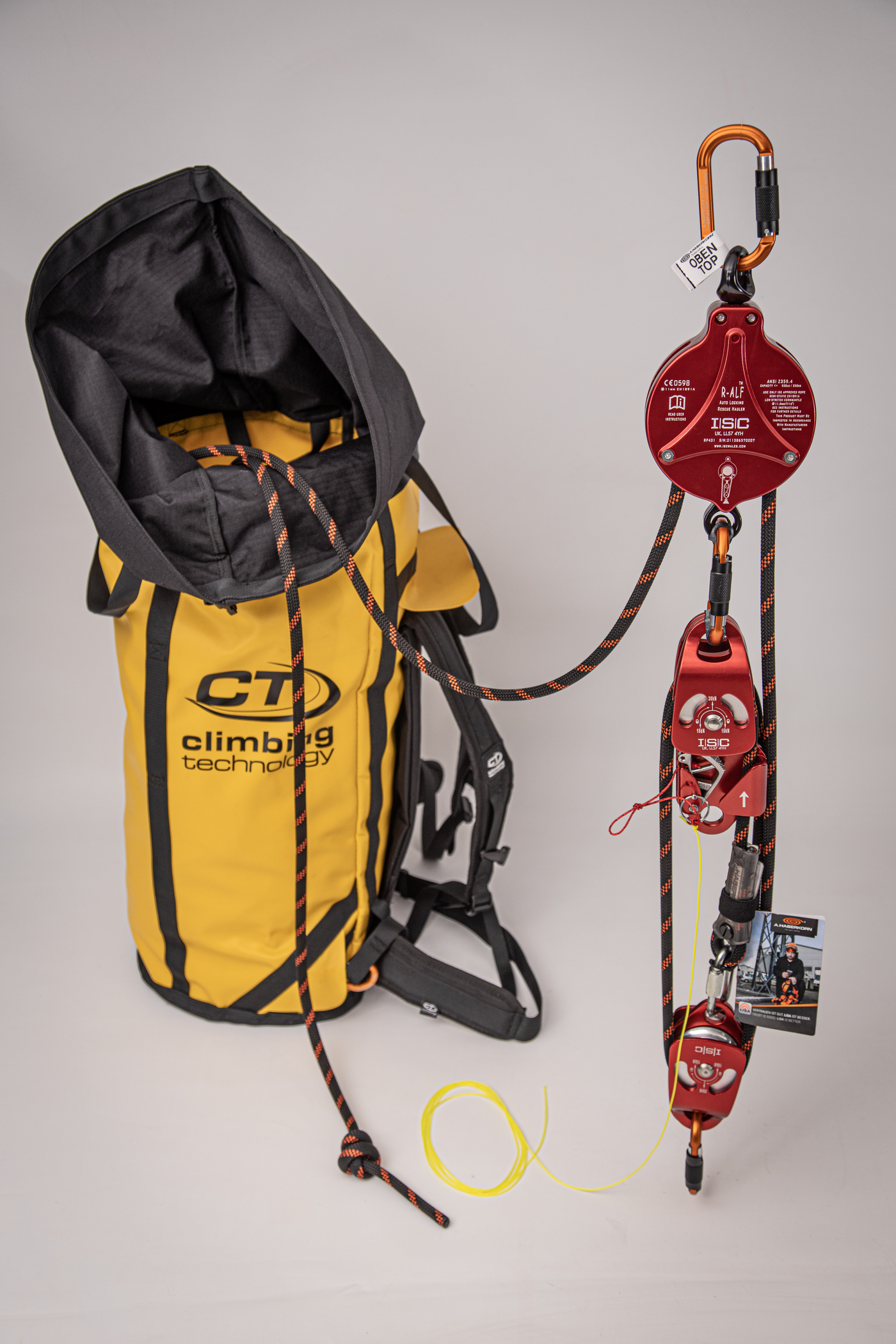 Das 5:1 R-ALF-System bietet einen mechanischen Vorteil gegenüber herkömmlichen Flaschenzugsets und eignet sich daher für Rettungseinsätze oder sogar für den Einsatz in der Arbeitsplatzpositionierung, wie beim Arbeiten in engen Räumen. Die Fliehkraftbremse blockiert automatisch, wenn der Benutzer die Kontrolle über das Gerät verlieren sollte.